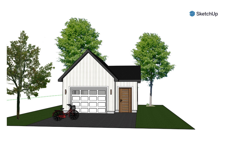 Illustration 3D d'un garage réalisé avec le logiciel SketchUp. Revêtement blanc de style «planches et baguettes» avec toiture en tôle d'aluminium noire.